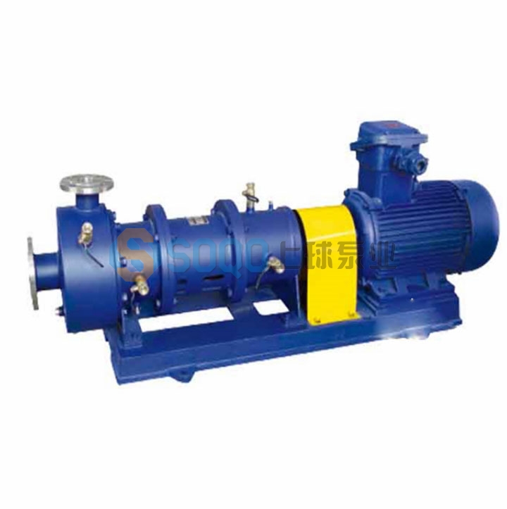 磁力驅(qū)動離心泵(簡稱磁力泵),通常由電動機,磁力偶合器和耐腐蝕離心泵組成,其主要特點是利用磁力偶合器傳遞動力,完全無泄露,當電動機帶動磁力偶合器和外磁鋼旋轉(zhuǎn)時,磁力線穿過間隙和隔離套,作用于內(nèi)磁鋼上,使泵轉(zhuǎn)子與電動機同步旋轉(zhuǎn),無機械接觸地傳遞扭矩。在泵軸的動力輸入端,由于液體被封閉在靜止的隔離室內(nèi),沒有動密封因而完全無泄露。泵的過流部件根據(jù)需要可分別采用304、304L、302、321、316、316L、UB6、CD4MCu、鈦合金、鎳基合金等耐腐蝕材料。CQGB保溫型磁力泵是全國聯(lián)合設(shè)計組開發(fā)的新型完全無泄露耐腐蝕泵,其技術(shù)經(jīng)濟指標與國外同類產(chǎn)品的水平相當。