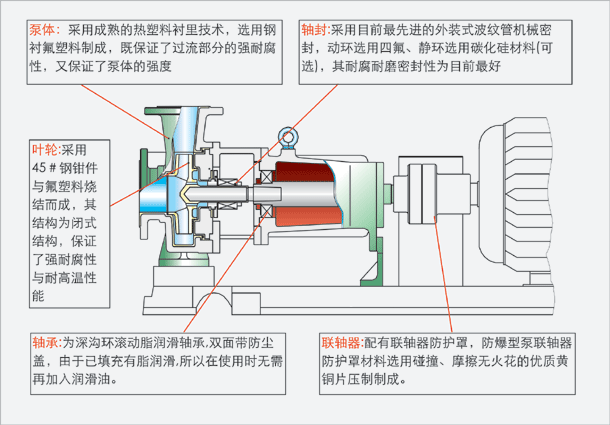 泵體采用金屬外殼內(nèi)襯聚全氟乙丙烯(F46),泵蓋、葉輪和軸套均用金屬嵌件外包氟塑料整體燒結(jié)壓制而成,軸封采用外裝式先進的波紋管機械密封,靜環(huán)選用99.9%氧化鋁陶瓷(或氮化硅),動環(huán)采用四氟填充材料,其耐腐耐磨密封性極好。泵的進出口均采用鑄鋼體加固,以增強了泵的耐壓性。