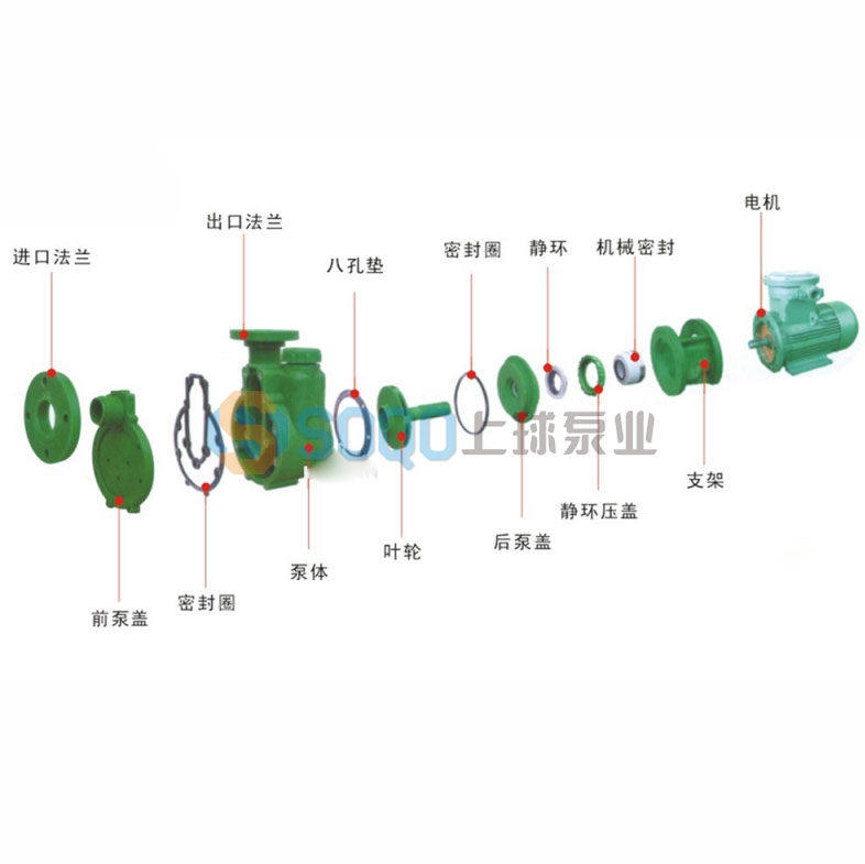 采用增強聚丙烯(CFR-PP)一次注塑成型。自吸泵機械強度高,耐腐蝕性能強。