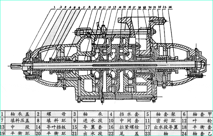 D型水泵主要零件有:進水段、中段、出水段、葉輪、導翼擋板、出水段導翼、軸、密封環(huán)、平衡環(huán)、軸套、尾蓋及軸承體。