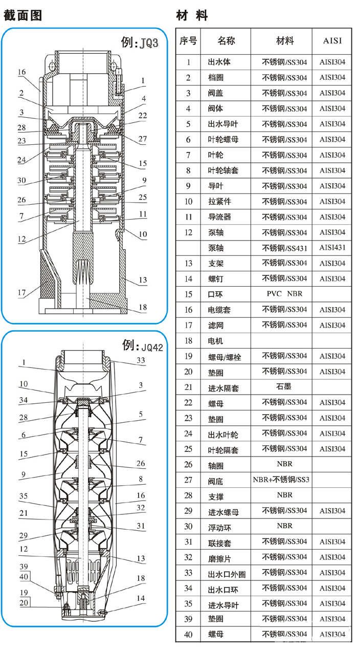 QJ型不銹鋼深井泵是引進(jìn)國外泵業(yè)公司領(lǐng)先的制泵技術(shù)生產(chǎn)的高性能耐磨型電泵,動力部份配用目前國際先進(jìn)技術(shù)生產(chǎn)的水浸式不銹鋼潛水電機(jī),對水質(zhì)絕對無污染,是當(dāng)前國內(nèi)外深井泵之精品。選用優(yōu)質(zhì)不銹鋼外殼、軸芯、聯(lián)軸器、入水座和泵頭(或銅合金入水座、泵頭),高強(qiáng)度抗耐磨新型復(fù)合高分子材料葉輪和不銹鋼導(dǎo)流殼,全新“浮動式”結(jié)構(gòu)葉輪在工作期間對電機(jī)無軸向壓力。特別適用于工礦業(yè)、農(nóng)業(yè)、建筑業(yè)、養(yǎng)殖業(yè)、食品飲料業(yè)及家庭式(或高層送水使用)。