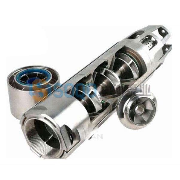 2、潛水泵每級導(dǎo)流殼中裝有一個橡膠軸承;葉輪用錐形套固定在泵軸上;導(dǎo)流殼采用螺紋或螺栓聯(lián)成一體。
