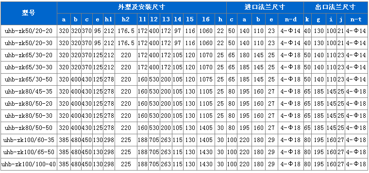 UHB-ZK系列耐腐耐磨泵是一種能適應(yīng)各種不同的工況條件的泵,如輸送酸、堿性清液或料漿;冶煉行業(yè)各種腐蝕性礦漿;硫酸行業(yè)各類稀酸;環(huán)保行業(yè)各類污水等。該泵既耐腐蝕又耐磨損,使用范圍十分廣泛。具有如下特點: