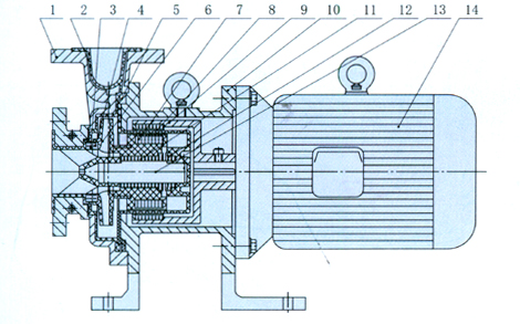 磁力驅(qū)動離心泵(簡稱磁力泵),通常由電動機,磁力偶合器和耐腐蝕離心泵組成,其主要特點是利用磁力偶合器傳遞動力,完全無泄露,當(dāng)電動機帶動磁力偶合器和外磁鋼旋轉(zhuǎn)時,磁力線穿過間隙和隔離套,作用于內(nèi)磁鋼上,使泵轉(zhuǎn)子與電動機同步旋轉(zhuǎn),無機械接觸地傳遞扭矩。在泵軸的動力輸入端,由于液體被封閉在靜止的隔離室內(nèi),沒有動密封因而完全無泄露。泵的過流部件根據(jù)需要可分別采用304、304L、302、321、316、316L、UB6、CD4MCu、鈦合金、鎳基合金等耐腐蝕材料。