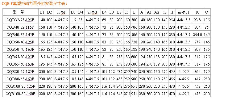 注:表中型號從CQB20-14-100F到CQB100-80-160F均可配防爆電機。