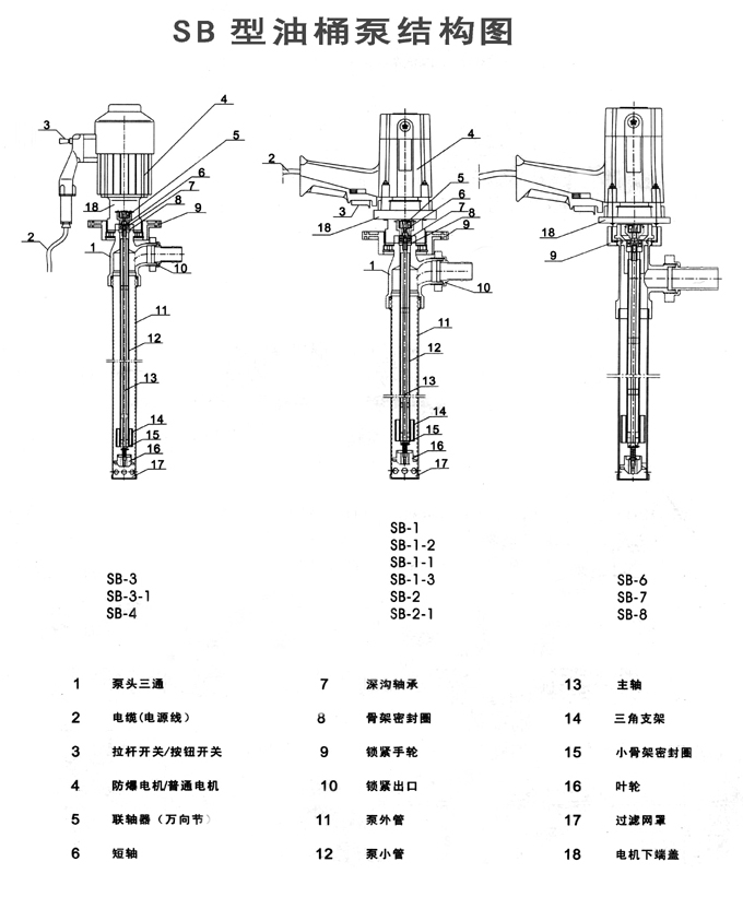 SB系列電動油桶泵可以直接插入物料桶(最大適用于符合GB/325-1991標準的鋼桶)中抽取桶中液體?奢斔透鞣N油料、帶腐蝕性化學藥水、其他液體。根據(jù)所輸送的液體性質(zhì),電動油桶泵泵體沾濕部分材料可選用鋁合金、不銹鋼,316不銹鋼等組成。驅(qū)動電機配備單相標準電機,防爆電機,高轉(zhuǎn)速電機等多種選擇。