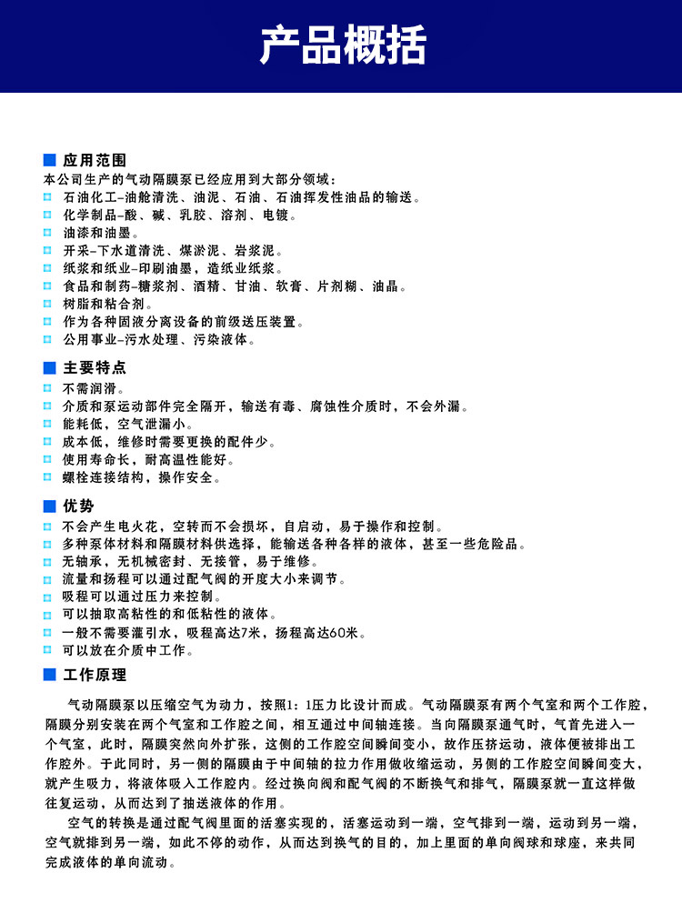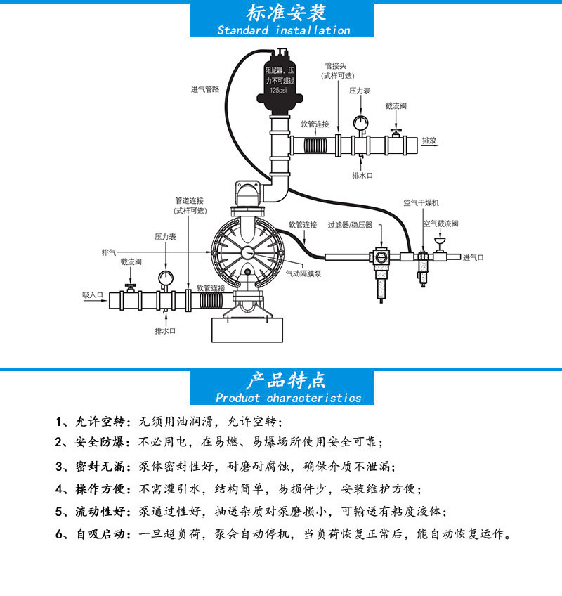 QBYS型全工程塑料腐蝕氣動(dòng)隔膜泵是用壓縮空氣為動(dòng)力源,通過(guò)氣閥往復(fù)運(yùn)動(dòng)分配空氣,帶動(dòng)隔膜擠壓輸送介質(zhì)的容積式泵,該泵集雜質(zhì)泵、自吸泵、泥漿泵、屏蔽泵、潛水泵等輸送機(jī)械的優(yōu)點(diǎn)。 襯氟隔膜泵是由上海正奧生產(chǎn)的,該產(chǎn)品具有良好的物理性能,以F46為內(nèi)襯材料,可適用于任何酸、堿及各類有機(jī)溶劑。如王水,氫氧化鉀等,應(yīng)用范圍極其廣泛系列泵具有結(jié)構(gòu)美觀,良好的物理抗性,經(jīng)久耐用等特點(diǎn),對(duì)于各種腐蝕性液體、帶顆粒、高粘度、易揮發(fā)、易燃、易爆、劇毒的液體、陶瓷釉漿、果漿、膠水、油輪倉(cāng)底油回收、臨時(shí)倒罐等液體均能予以抽光吸盡,尤其可以解決葉片式泵的跑、冒、滴、漏及不允許空轉(zhuǎn)等問(wèn)題,一種采用壓縮空氣為動(dòng)力源,通過(guò)氣閥往復(fù)運(yùn)動(dòng)分配空氣,帶動(dòng)隔膜擠壓輸送介質(zhì)的容積式泵,該泵集雜質(zhì)泵、自吸泵、泥漿泵、屏蔽泵、潛水泵等輸送機(jī)械的優(yōu)點(diǎn)。