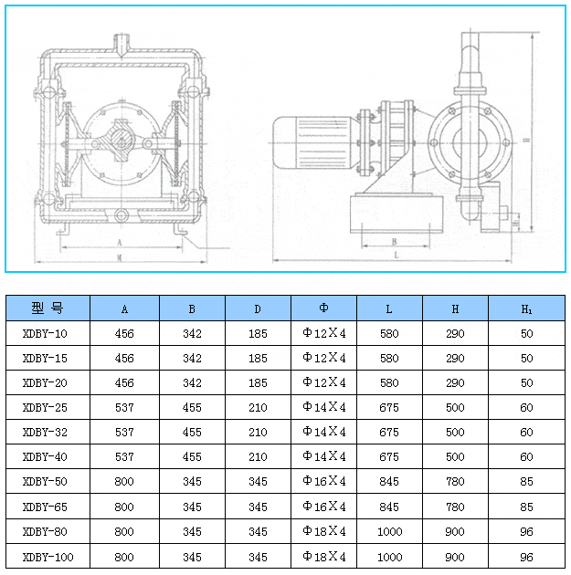上球公司的XDBY型電動(dòng)隔膜泵,采用XLD系列擺線針輪減速機(jī)傳動(dòng)動(dòng)力,電動(dòng)隔膜泵是一種新型的泵類,近年來(lái),由于在隔膜材質(zhì)上取得了突破性的進(jìn)展,國(guó)際上越來(lái)越多的工業(yè)化國(guó)家采用此種型式的泵,取代部份離心泵、螺桿泵,來(lái)應(yīng)用于石化、陶瓷、冶金等行業(yè),產(chǎn)品設(shè)計(jì)均參考美國(guó)ABEL公司樣機(jī),該泵適用于低壓,即出口壓力≤3kgf/cm2的場(chǎng)合。